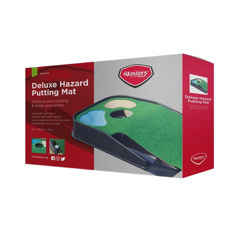 All the more reason to practice, better putting will lower your score dramatically. The Masters Deluxe Hazard Putting Mat will help you achieve this. It is made from specially selected synthetic matting to ensure consistent roll and accuracy of the ball. It is raised at one end with a hole to give a real ‘on the green’ feel. It also features a bunker and a water hazard and will return the ball – what more could you ask for!