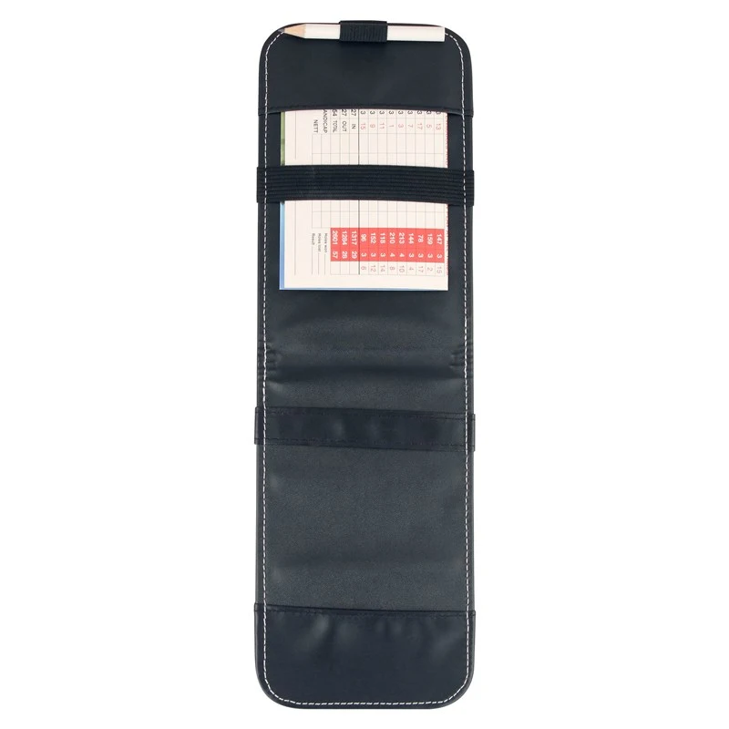 A leatherette protective case for your score card, keeping it dry and providing a firm writing surface.