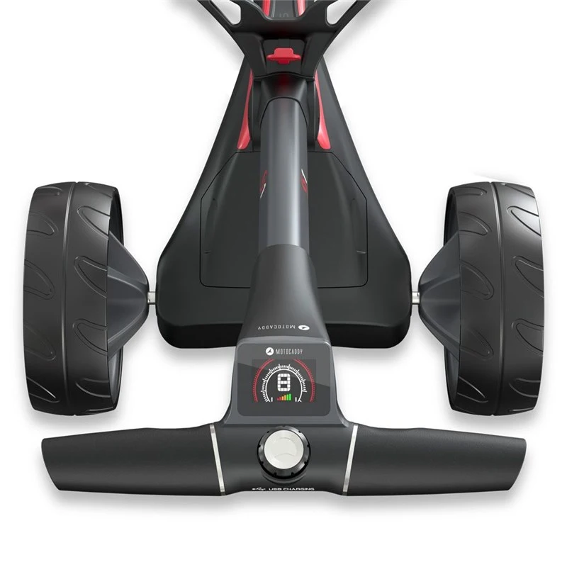 The new S1 DHC (Downhill Control) Electric Motocaddy Trolley gives sporty looks and features all-terrain wheels and an electronic parking brake. Simple 1-step folding is a great feature of the S1, together with all the functionality you could want in a top-quality electric golf trolley. Cable-free battery technology with auto-disconnect and a quick access point for charging on the move are all there for your convenience and to enjoy. The handle also gives the option for USB charging for many electronic devices.