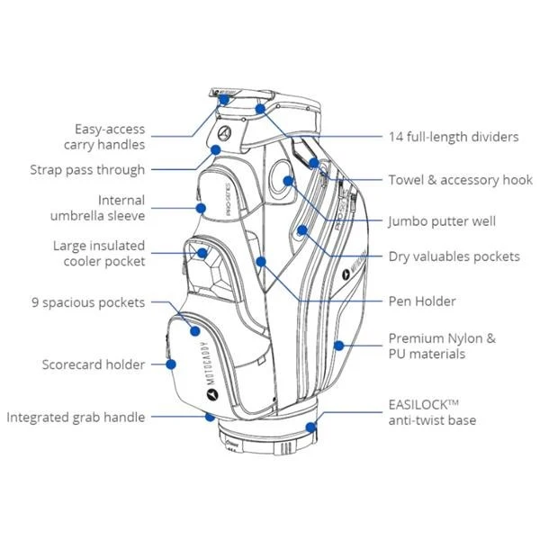 Manufactured from long-lasting premium PU and Nylon fabrics, the Pro-Series is packed with impressive features including 9 spacious pockets, beverage storage, and a jumbo putter well.