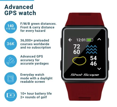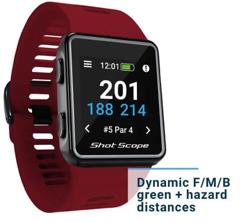 Shot Scope G3 is a highly accurate GPS watch with distances to greens available in yards or metres. G3 also provides distances to the front and back of hazards, allowing you to come up with a strategy for the hole. G3 comes preloaded with over 35,000 courses worldwide and free firmware updates.