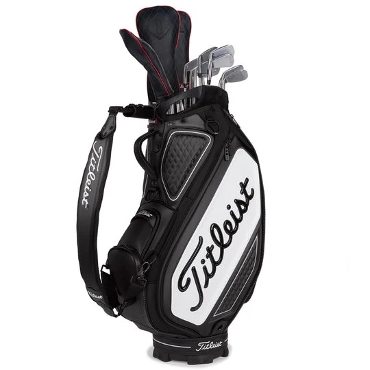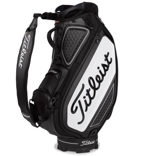 Titleist Tour Series Tour Bag. The new Titleist Tour Series Tour Bag – A retail version of the bag used on tour with tour validated features and design elements. Features include a 3-point, single shoulder strap, 5 way top with integrated handles, new rain hood design and fully waterproof zippers (except for removable belly panel). This 10 pocket design also includes a magnetic velour lined valuables pocket and two neoprene lined, easy access drink sleeves. Constructed in durable materials and finished with quilted highlights. Weight – 4.8 KG’s.